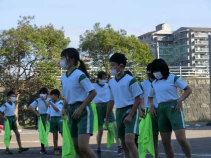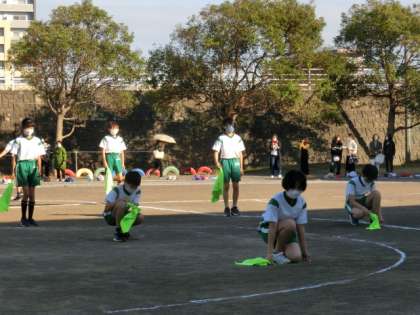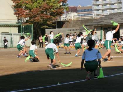 5年生の「レッツ フォークダンス」です。緑色のバンダナがよく映えて、子供たちのダンスを彩っています。