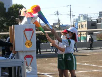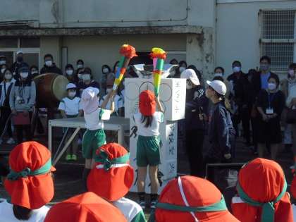 1.6年生の部から引き継がれた聖火を、3年生4年生の代表の子が点火します。