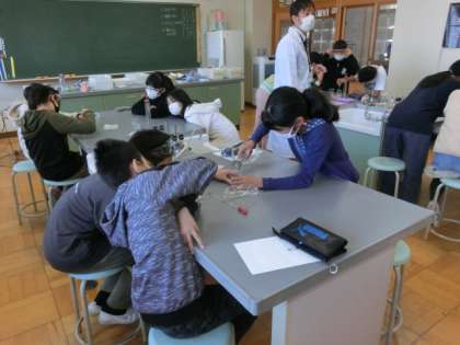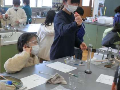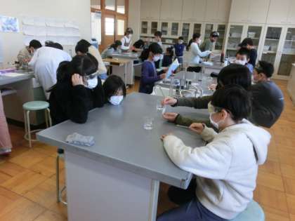 5年2組の理科では、食塩が水のどれくらいとけるのかを調べるために、まず50mlの水を正確に計って、メスシリンダーに入れ、食塩を溶かしていく実験を行っていました。