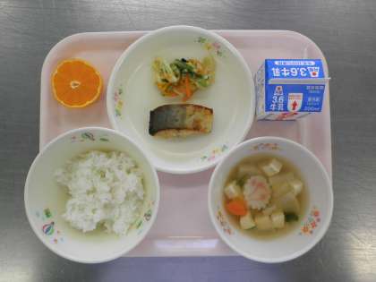 今日の給食は、ごはん・牛乳・さわらの西京焼き・こまつなの煮浸し・豆腐のすまし汁・みかんです。(給食機器の不具合のため、一部の献立が変更になっています。)