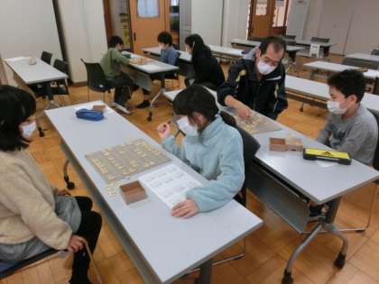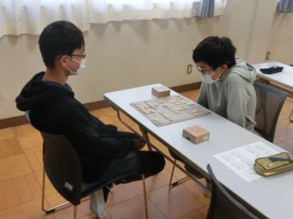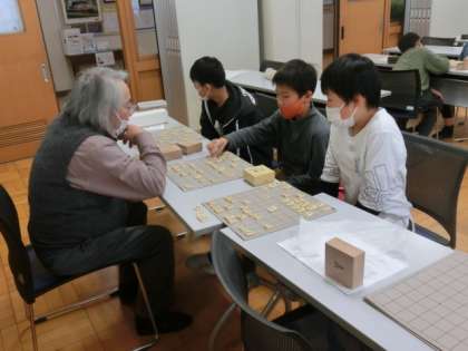 将棋クラブでは、真剣勝負です。講師の先生に3人の子が挑戦していました。