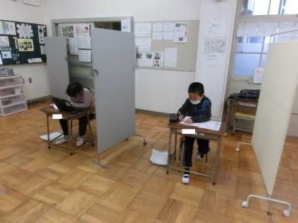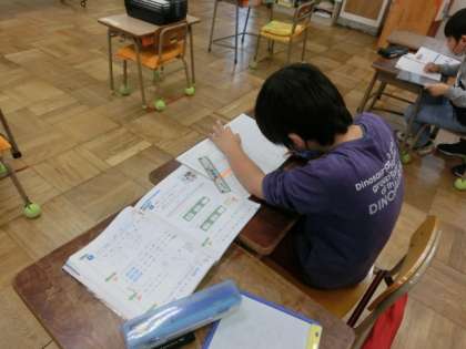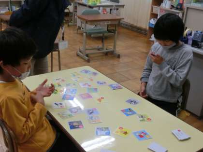 7の1組では、算数の学習です。繰り下がりの引き算の練習問題をがんばってやっていました。7の2組では、カルタをやっています。札を読む人とカルタをとる人を交代でやりながら楽しんでいました。7の3組では、ローマ字の学習です。ローマ字を使って、お話を作ろうとしていました。