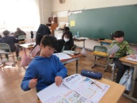 1時間目。5年2組の子たちが、言葉について調べ、レポート作りをしています。