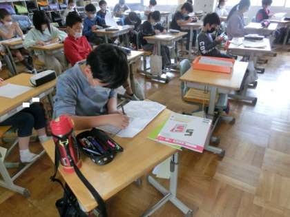 5年1組の算数です。合同な図形をどう描くのかが課題です。自分で考えた後、黒板や大型テレビを使って、考え方を説明しています。