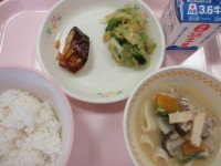 今日の給食は、ごはん・牛乳・お豆と南瓜のコロッケ・ゴーヤとツナのチャンプルー・もずくスープです。今日の副菜は、沖縄県でよく食べられているゴーヤを使った「ゴーヤとツナのチャンプルー」です。『チャンプルー』とは、沖縄の方言で「まぜる」という意味です。今日は、ゴーヤとツナ、焼き豆腐などをチャンプルーしました。日本には、16世紀の末くらいに伝わってきました。ゴーヤは、つるがのびて成長し、実がつくので、最近では、ベランダなどに緑のカーテンとして育てる人も増えてきました。栄養面では、ビタミンCが豊富にふくまれます。少し苦みがありますが、塩もみをしたり、下ゆですることで苦みがやわらぎます。旬のゴーヤを味わってみてください。