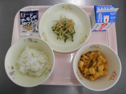 今日の給食は、ごはん・牛乳・豆腐のチリソース煮・もやしときゅうりの中華サラダ・アーモンド小魚です。今日の副菜は「もやしときゅうりの中華サラダ」です。5mmくらいの緑豆という小さい豆を水につけ、暗い所に置くと数日でもやしになります。もやしは、1年中栽培でき、値段も安いので、いろいろな料理に使われます。豆の状態では、ほんのわずかしか含まれていないビタミンCが、もやしにはたくさん含まれており、シャキシャキとした食感がおいしい野菜です。もやしは、芽が出るという意味の「萌ゆ」が変化し「もやし」と呼ばれるようになったといわれています。