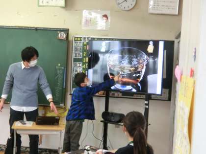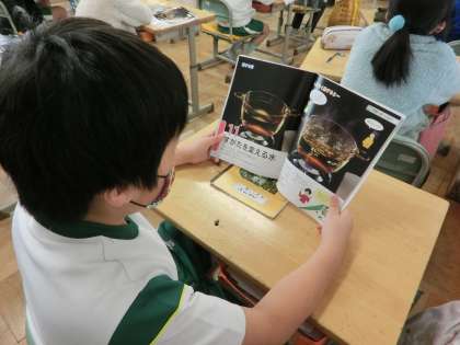 4年3組の理科です。熱する前と熱した後の水の様子について何が起こっているのか考えようとしています。「沸騰している。」「あわがボコボコ出ている。」「あたたかい空気が上に上がっている」「でもなんで水なのに空気があるのかなあ」など、写真を見ただけでいろいろな気付きや疑問が出ていました。