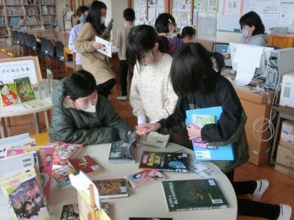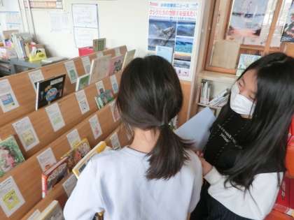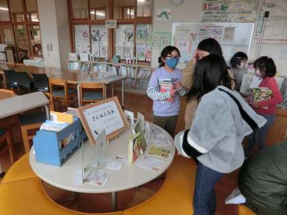 1組の子たちが図書館で本を借りています。先日図書委員会の子たちが放送で紹介してくれた「一回も借りられたことのない残念な本」にも興味を持って見ています。