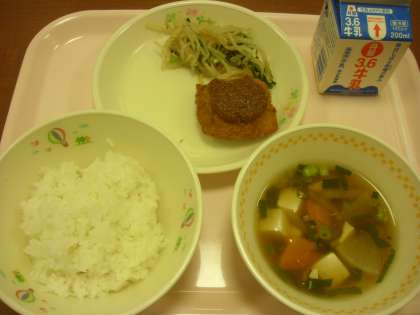 今日の献立は、「ごはん・牛乳・ぬっぺい汁・青菜ともやしのおひたし・たらフライごま入りケチャップソース」です。鱈(たら)は、身が柔らかく、味もたんぱくで、どのような料理でもおいしく食べることのできる魚です。