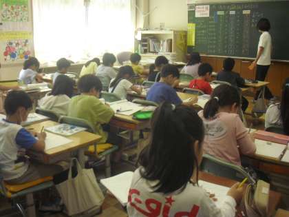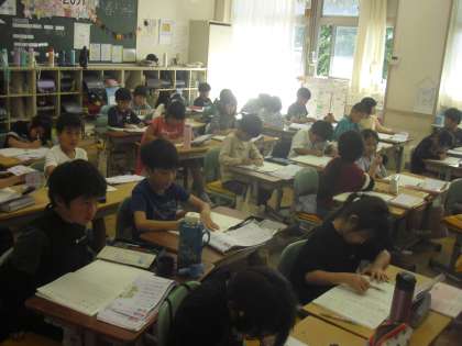 2年生です。2組は、かけ算九九の学習に取り組んでいます。1組は、ドリルの学習をがんばっています。