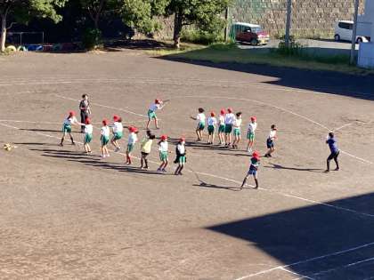 1時間目の6年生です。運動場で大縄跳びに挑戦しています。