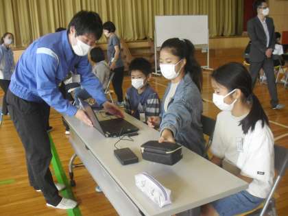 5年生「ドローン教室」の様子です。明電舎のみなさんが、プログラミング学習のゲストティーチャーとして、本校にお越しいただきました。1学期には、6年生も教えていただきました。プログラムをして、ドローンを目指す場所に飛ばすことができるかグループの仲間と挑戦します。