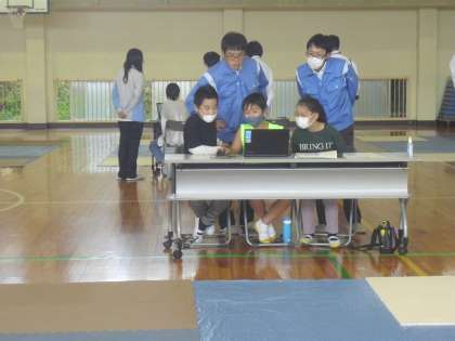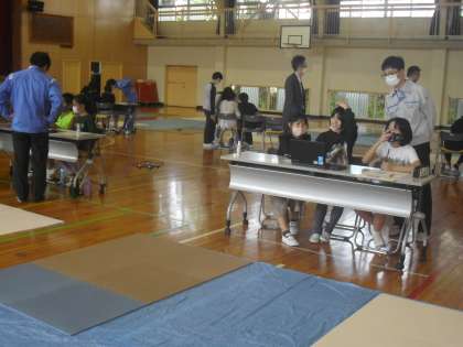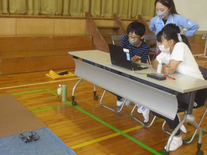 5年生「ドローン教室」の様子です。明電舎のみなさんが、プログラミング学習のゲストティーチャーとして、本校にお越しいただきました。1学期には、6年生も教えていただきました。プログラムをして、ドローンを目指す場所に飛ばすことができるかグループの仲間と挑戦します。