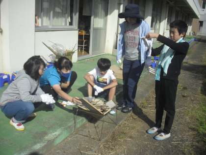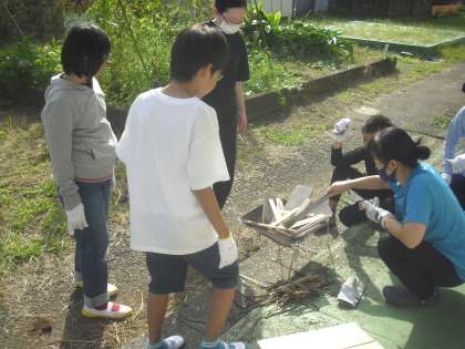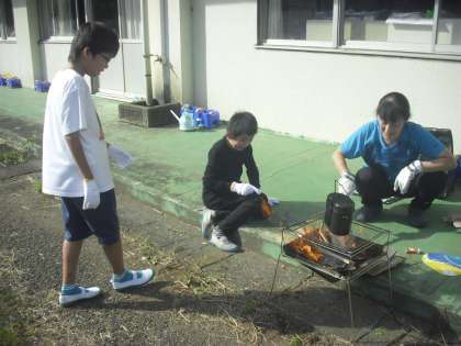 7組です。5年生が火起こしに挑戦しました。来月に行われる自然教室に向けた練習です。消防署からも許可をもらい、実施しました。自分たちでごはんを上手に炊くことができました。