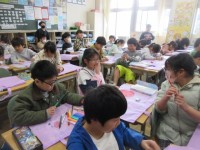 3年1組は、英語の学習で、自分の名前をローマ字で書いて、カードを作っています。楽しく活動しています。