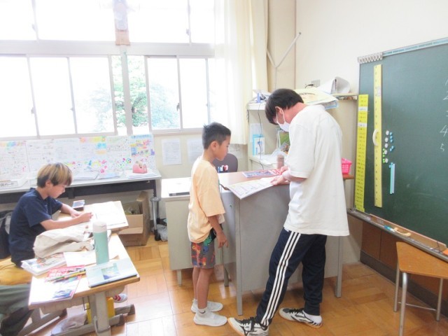 2組は、国語「新出漢字」の学習です。漢字ドリルを使いながら、返、通、開、全などの新出漢字の書き方や読み方を学習しています。先生から、花丸をもらってうれしそうでした。