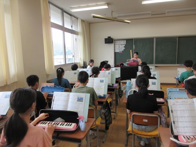 6年1組は、音楽「おぼろ月夜」の学習です。各自で鍵盤ハーモニカを自由練習した後、ピアノの伴奏者の子が弾き始めると、クラス全員のリズムが一気にそろい、素敵な演奏となりました。