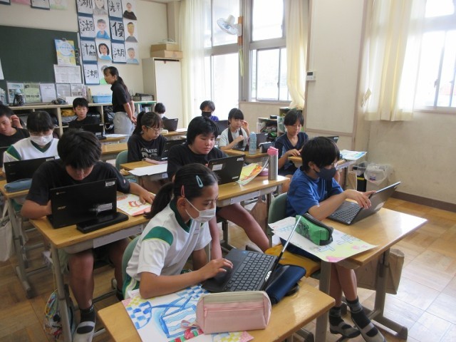 2組は、図工です。できあがった「文様」の作品をChromebookで写真に撮り、次にCanvaで「人権ポスター」の案を考えています。