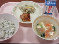 今日の献立は、ご飯、おから入り松風焼き、和風サラダ、けんちん汁、牛乳です。今日で...