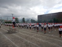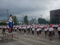 開会式の様子です。五中生徒会役員の中学生が、激励の言葉をかけてくれました。青空が広がる下で、両校の校歌を元気よく歌いました。1年生の誓いの言葉では、3人とも大きな声でしっかりと話ができました。