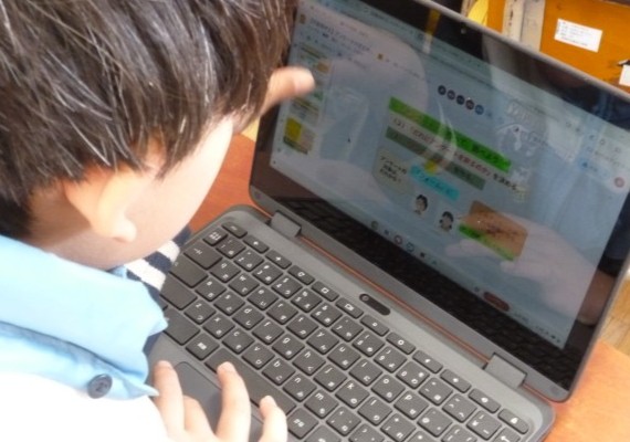 「重さ」の学習のまとめをしました。「学びを生かそう」の練習問題を解いていました。リモート参加している友達とも、画面越しに交流をしていました。