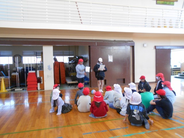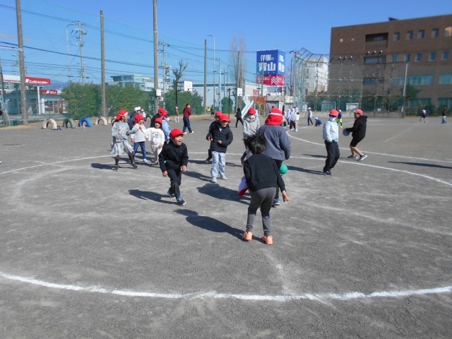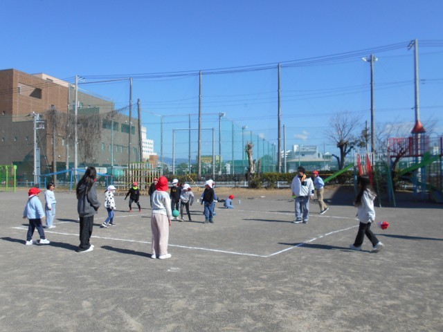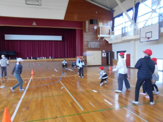 室内ではばくだんゲームやなんでもバスケット、新聞紙じゃんけんなどで遊んでいました。体育館は2グループともドッジボールをしていました。