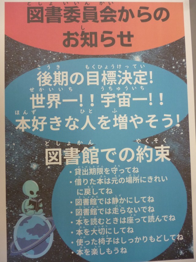 これから「後期図書委員会」の活動が本格的になっていきます。運動会への取り組み等もありますが、子供たちには、めあての「世界一!! 宇宙一!! 本好きな人を増やそう!」の達成に向けて、活動を進めていってほしいと願っています。