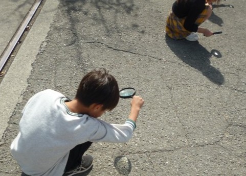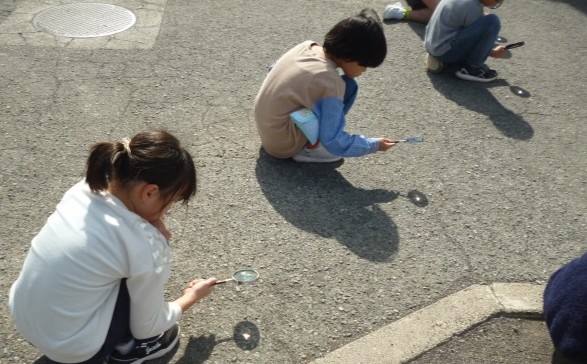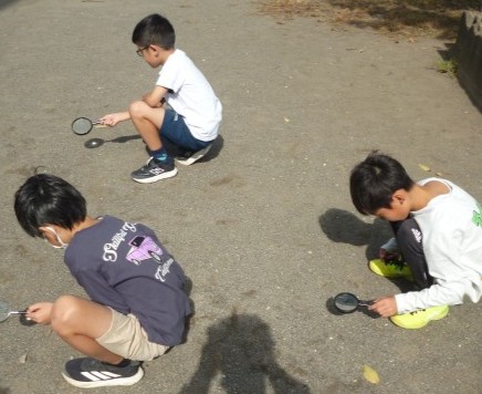 今回は、日光を「鏡」で反射させたり、「鏡」や「虫めがね」で集たりして、日光の進め方や明るさ、温度を調べていきました。
