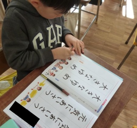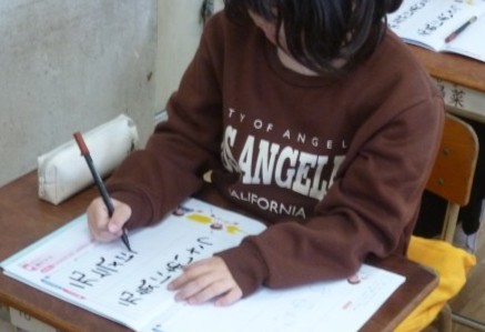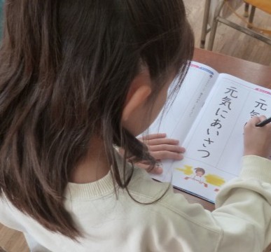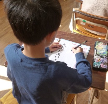 子供たちは、フェルトペンなどの持ち方に気を付けて、手本を見ながら整った文字を書こうとしていました。