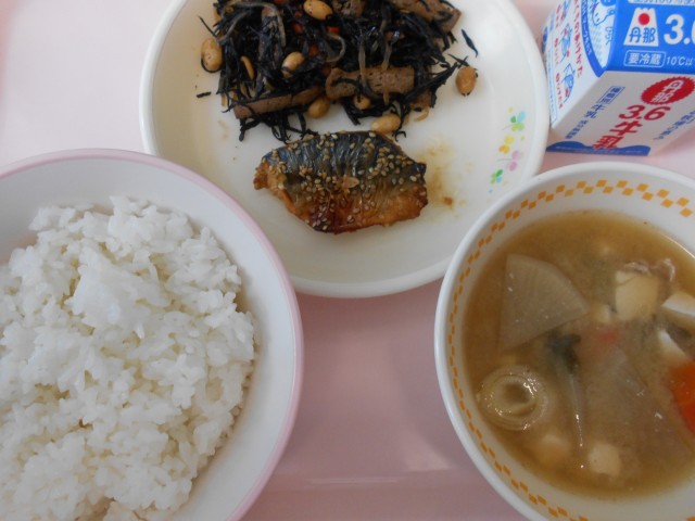 人参、大根、ごぼう、里芋が入っている体があたたまる豚汁です。6年1組の子どもたちは、副菜にひじきの煮物を選ぶ人が多かったです。
