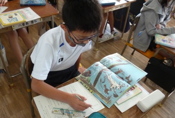 国語では、国語:「本から発見したことを伝え合おう」の学習の一貫で、「本の『ポップ』作り」を進めています。