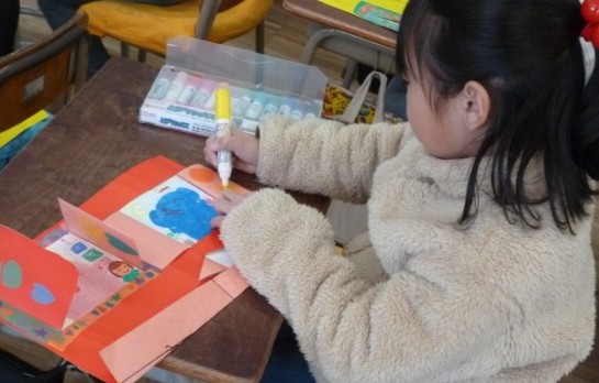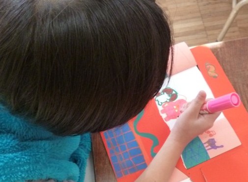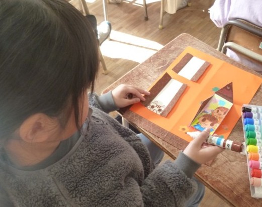 今回は、部屋の中や窓、建物の壁などを仕上げていきました。カラーペンやクーピーを使って、自分の思いが詰まった建物を仕上げることができました。