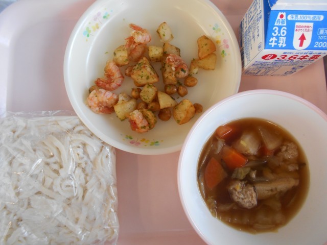 1月19日(月) 今日の給食 公開日 2026/01/19 更新日 2026/01/19 今日の給食 今日の献立は、 ☆うどん ☆小えびとポテトの唐揚げ ☆ちゃんこうどんの汁 ☆ぎゅうにゅう です。 ちゃんこうどんの肉団子は、給食室で手作りでした♪ 小さすぎず大きすぎずバラつきのないように上手に心を込めて作ってくれました。 いいね(0)