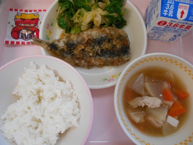 今日の給食では、「いわしの蒲焼き」と「福豆」を出しました。