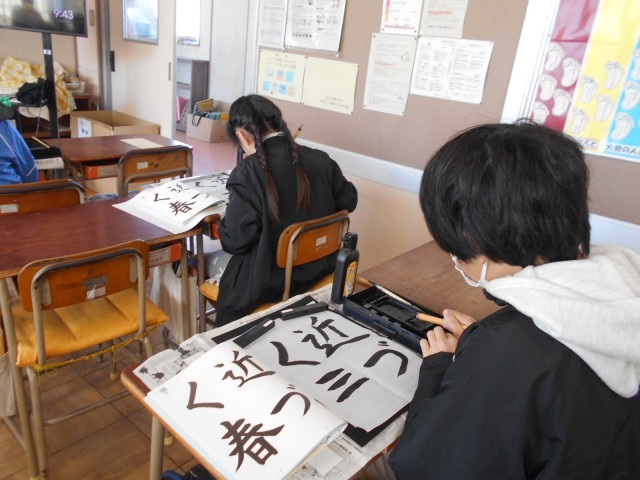 今日の題字は「近づく春」です。四文字をバランス良く書いています。一文字一文字、添削していただきながらたくさん褒めてもらいました。