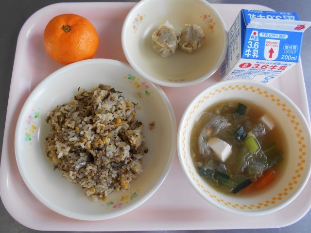 沼津茶で炊いた茶飯を根深ねぎ、かつおフレーク、たまごの具材と混ぜ合わせた「お茶~ハン」、県内産のしらすが入った「しらすシューマイ」、給食での登場回数は少ないですが、クセがなく食べやすいレタスを主役にした「豆腐とレタスの中華スープ」です。