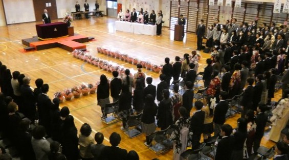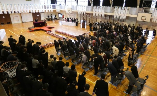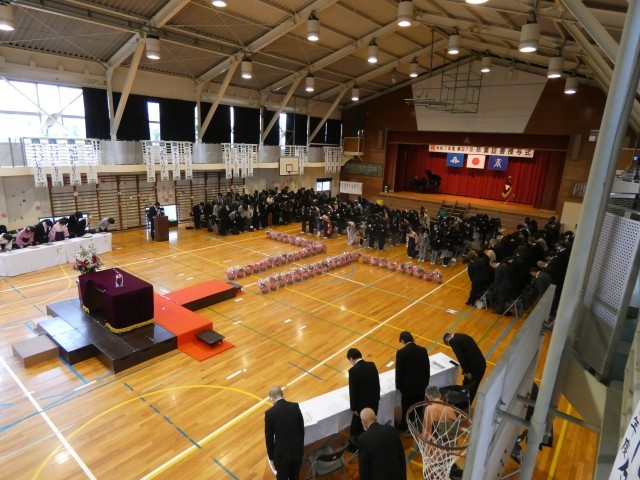 「閉式の言葉」「一同敬礼」と式が終わり、卒業生が退場していきます。