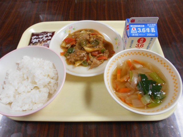 今日の給食は、「ご飯、牛乳、ホイコーロー、春雨スープ、アーモンド小魚」でした。みんなで美味しくいただきました。