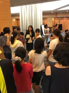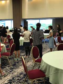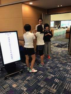 食事係が一足先に朝食会場に集合しました。アルコール消毒をして班の友達を待ちます。