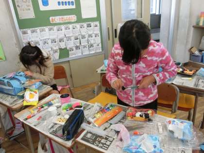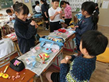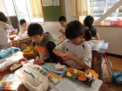 2年生が図工の時間に「ゆめのおべんとう」を作っていました。だいぶ出来上がってきました。お弁当箱のなかは、お寿司、たまごやき、たこのウインナー、いちご・・・。大好きなものがいっぱい詰まっています。