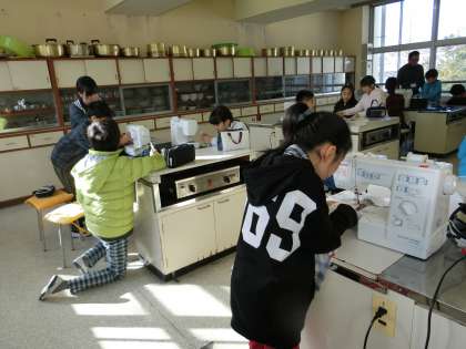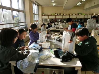 5年生が家庭科室でエプロンを作っていました。ミシンで縫ったり、紐を通したり、完成に近づいています。御協力くださっている保護者ボランティアの皆様、ありがとうございます。