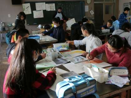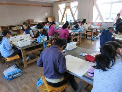 6年生が図工室で校舎の絵を描いていました。石井先生に来ていただき指導を受けています。専門的なアドバイスをもらい、みんながんばっています。どれも力作です。