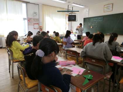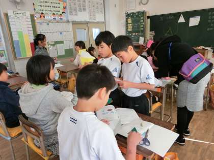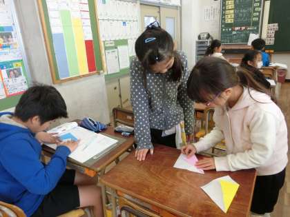 3年生が算数の時間に、折り紙を使って二等辺三角形と正三角形を作る方法を考えていました。折り紙は正方形です。その特徴をうまく利用して作ることができないか考えていました。友達と知恵を絞りながら挑戦していました。