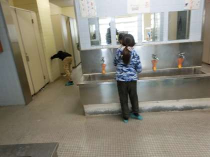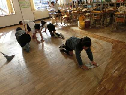 掃除の時間です。トイレ掃除をがんばる人、教室をきれいにする人、みんな口を結んで働いています。教頭先生が水槽をきれいにしてくれていました。ありがとうございます。