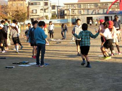 朝の運動場はなわとび運動一色です。ジャンピングボードで技を磨いたり、友だちと輪になって跳んだりしていました。