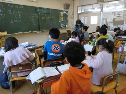 4年生が小数のわり算の計算練習をしていました。今まで学習したわり算のやり方をもとに、小数点の位置に気を付けて解いていました。