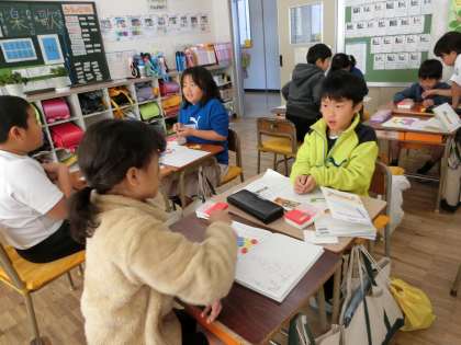 2年生が算数の時間にかけ算ゲームをしていました。2学期に学習した九九を使ったゲームです。友だちと一緒に楽しみながら九九の練習をしていました。