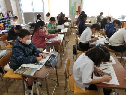 3年生が社会科の時間に、沼津のひものがどのように出荷されるのか、写真をもとに話し合っていました。みんなで見つけたことを交流し合って、しっかりとノートにまとめていました。