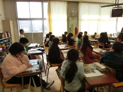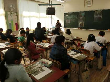 3年生が社会科の時間に、沼津のひものがどのように出荷されるのか、写真をもとに話し合っていました。みんなで見つけたことを交流し合って、しっかりとノートにまとめていました。