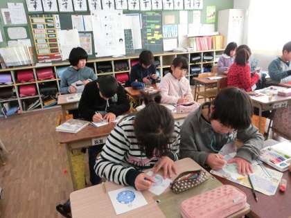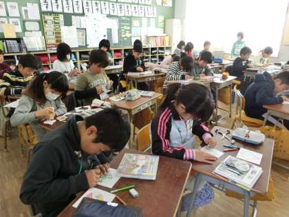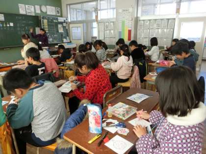 4年生が英語の時間にアナ先生と一緒にクリスマスプレゼントを作っていました。かわいいカードをいろいろな色で塗って仕上げていました。
